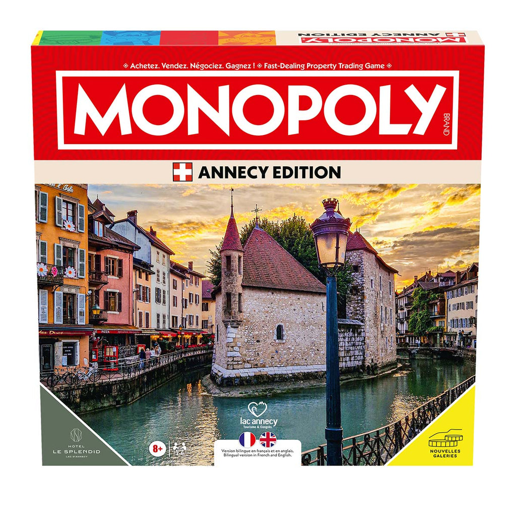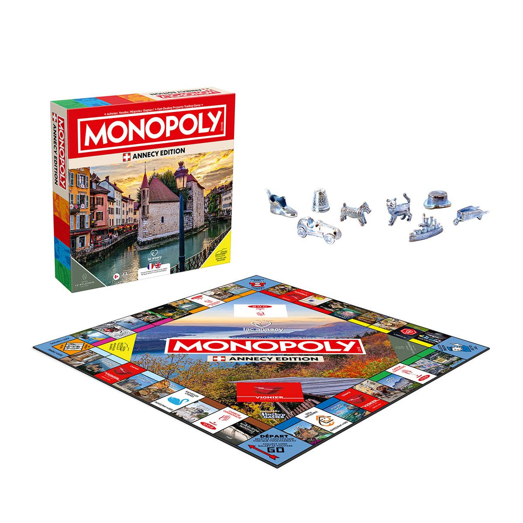 Monopoly Annecy est une édition spéciale du jeu de société le plus populaire au monde, inspirée par le caractère unique d’Annecy. Au fil de la partie, vous retrouverez les canaux romantiques de la ville, ses rues médiévales et les cafés qui bordent les rives du lac d’Annecy, le tout dans un spectaculaire décor alpin. Conçue pour les habitants, les anciens résidents et les visiteurs, cette édition transforme le gameplay classique de Monopoly grâce à un plateau entièrement personnalisé, des cartes à thématique locale et des références spécifiques tirées de l’histoire et du quotidien de la ville.